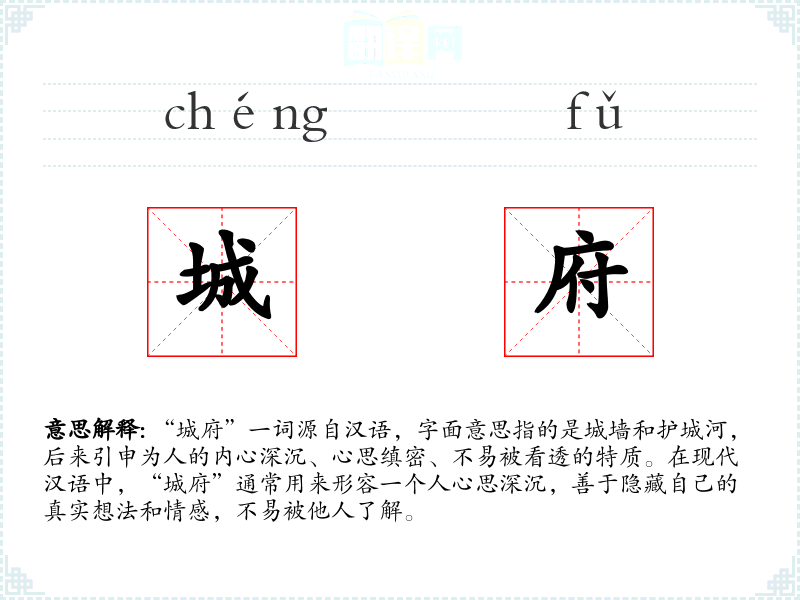 “城府”一词源自汉语,字面意思指的是城墙和护城河,后来引申为人的内心深沉、心思缜密、不易被看透的特质。在现代汉语中,“城府”通常用来形容一个人心思深沉,善于隐藏自己的真实想法和情感,不易被他人了解。