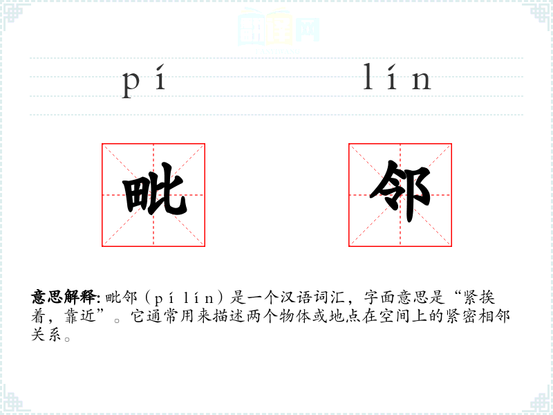毗邻(pí lín)是一个汉语词汇,字面意思是“紧挨着,靠近”。它通常用来描述两个物体或地点在空间上的紧密相邻关系。