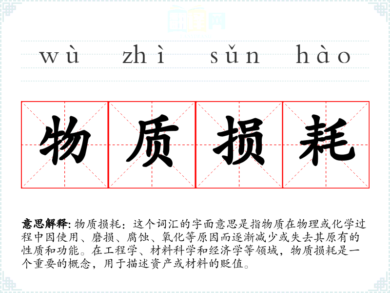 物质损耗这个词汇在中文中由“物质”和“损耗”两个词组成。“物质”指的是具体的物体或材料,“损耗”则指减少或失去。在英语中,类似的词汇可能是“material wear and tear”或“material depreciation”。