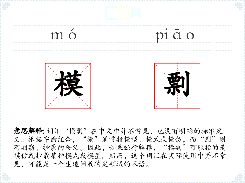 由于“模剽”不是一个标准词汇,我们无法给出一个确切的基本定义。如果必须解释,可以理解为“模仿或抄袭某种模式或模型”。