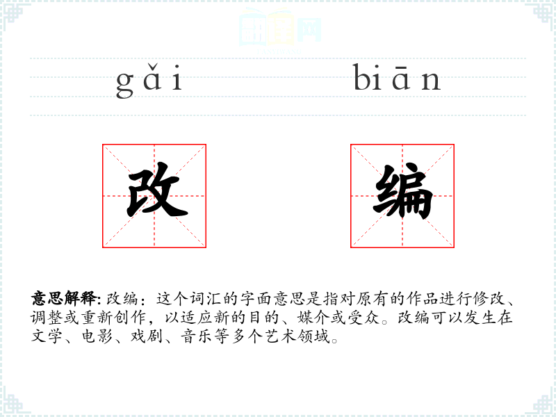 改编:这个词汇的字面意思是指对原有的作品进行修改、调整或重新创作,以适应新的目的、媒介或受众。改编可以发生在文学、电影、戏剧、音乐等多个艺术领域。
