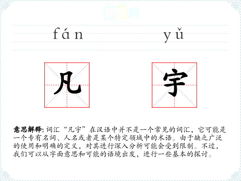 词汇“凡宇”在汉语中并不是一个常见的词汇,它可能是一个专有名词、人名或者是某个特定领域中的术语。由于缺乏广泛的使用和明确的定义,对其进行深入分析可能会受到限制。不过,我们可以从字面意思和可能的语境出发,进行一些基本的探讨。