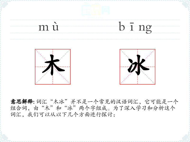 - 基本含义:由于“木冰”不是一个标准词汇,其含义可能需要根据具体语境来解释。