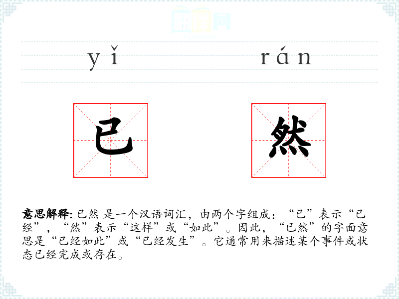 在英语中,“已然”可以对应为“already so”或“already happened”,但这种表达在英语中较少使用,更常见的是“already”或“has already happened”。