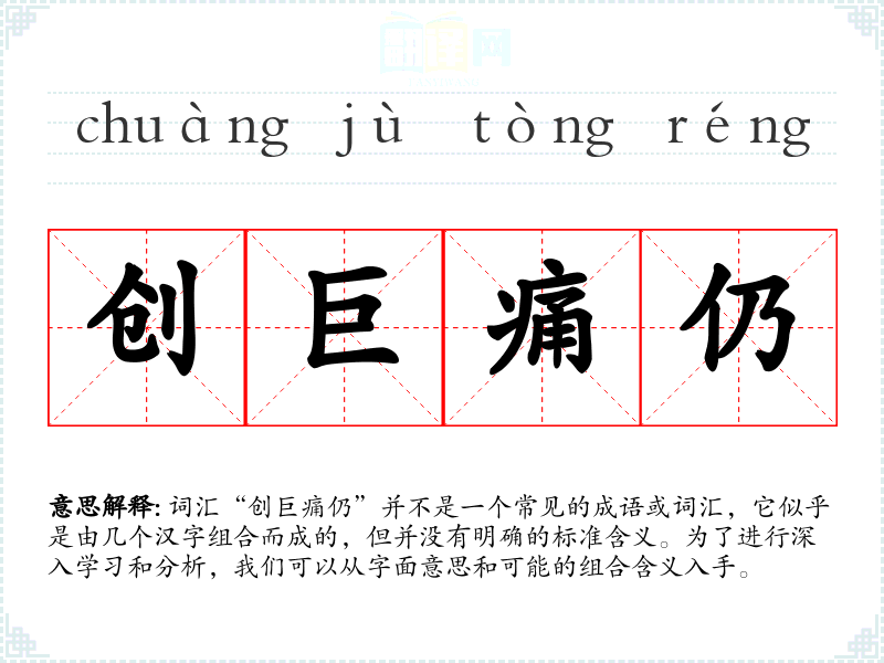词汇“创巨痛仍”并不是一个常见的成语或词汇,它似乎是由几个汉字组合而成的,但并没有明确的标准含义。为了进行深入学习和分析,我们可以从字面意思和可能的组合含义入手。