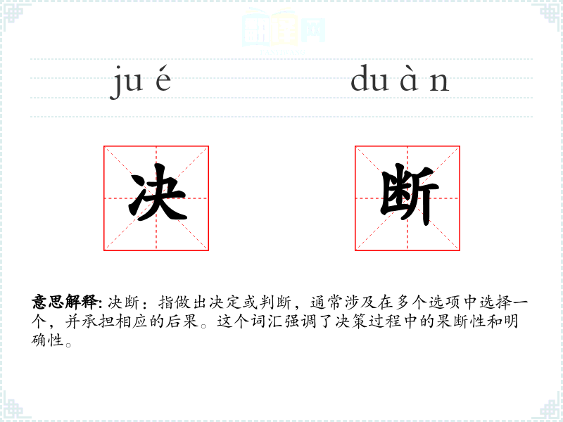 决断:指做出决定或判断,通常涉及在多个选项中选择一个,并承担相应的后果。这个词汇强调了决策过程中的果断性和明确性。