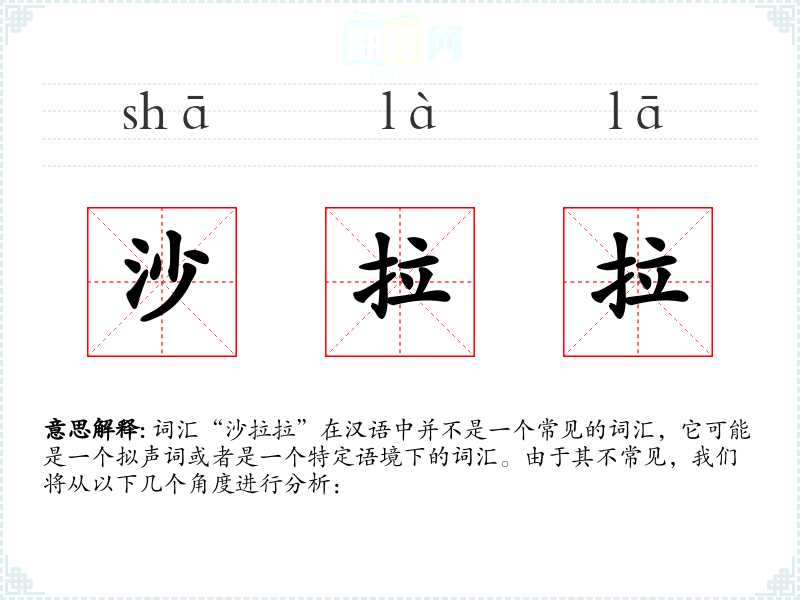 词汇“沙拉拉”在汉语中并不是一个常见的词汇,它可能是一个拟声词或者是一个特定语境下的词汇。由于其不常见,我们将从以下几个角度进行分析: