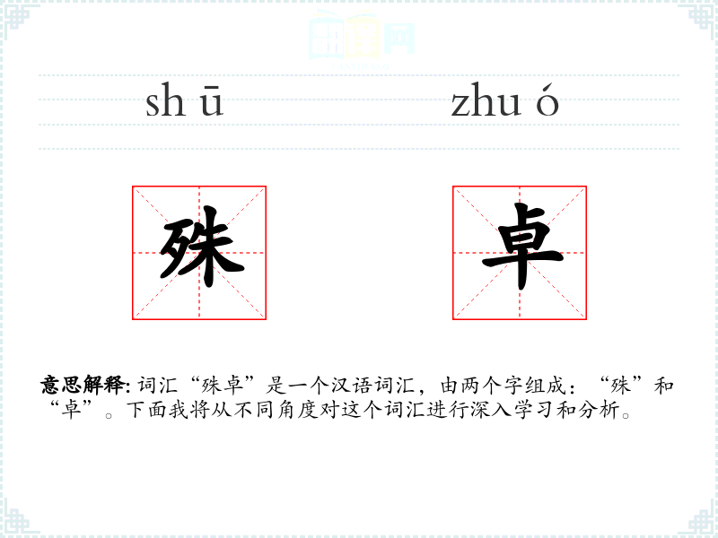 词汇“殊卓”是一个汉语词汇,由两个字组成:“殊”和“卓”。下面我将从不同角度对这个词汇进行深入学*和分析。