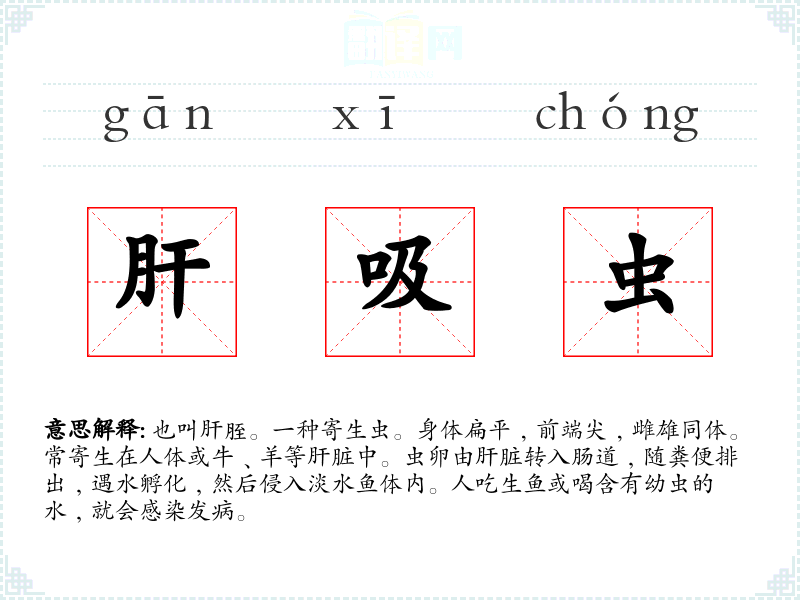 。身体扁平﹐前端尖﹐雌雄同体。常寄生在人体或牛﹑羊等肝脏中。虫卵由肝脏转入肠道﹐随粪便排出﹐遇水孵化﹐然后侵入淡水鱼体内。人吃生鱼或喝含有幼虫的水﹐就会感染发病。