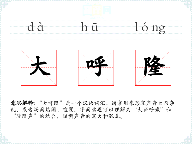“大呼隆”是一个汉语词汇,通常用来形容声音大而杂乱,或者场面热闹、喧嚣。字面意思可以理解为“大声呼喊”和“隆隆声”的结合,强调声音的宏大和混乱。