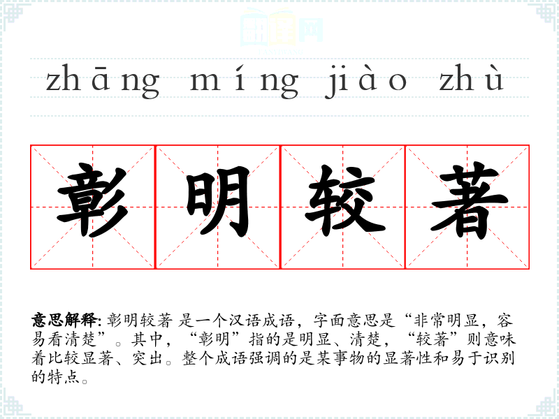 彰明较著 是一个汉语成语,字面意思是“非常明显,容易看清楚”。其中,“彰明”指的是明显、清楚,“较著”则意味着比较显著、突出。整个成语强调的是某事物的显著性和易于识别的特点。