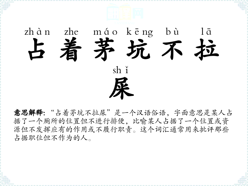 “占着茅坑不拉屎”是一个汉语俗语,字面意思是某人占据了一个厕所的位置但不进行排便,比喻某人占据了一个位置或资源但不发挥应有的作用或不履行职责。这个词汇通常用来批评那些占据职位但不作为的人。