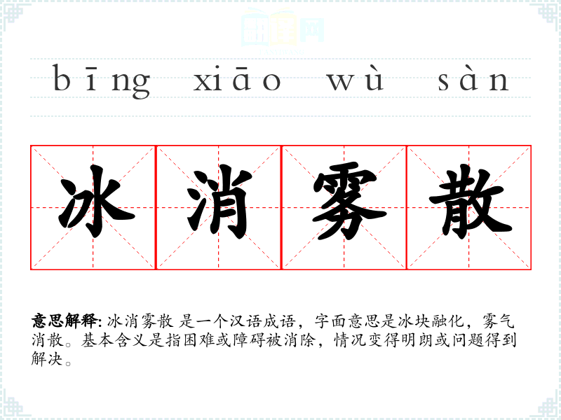 冰消雾散 是一个汉语成语,字面意思是冰块融化,雾气消散。基本含义是指困难或障碍被消除,情况变得明朗或问题得到解决。