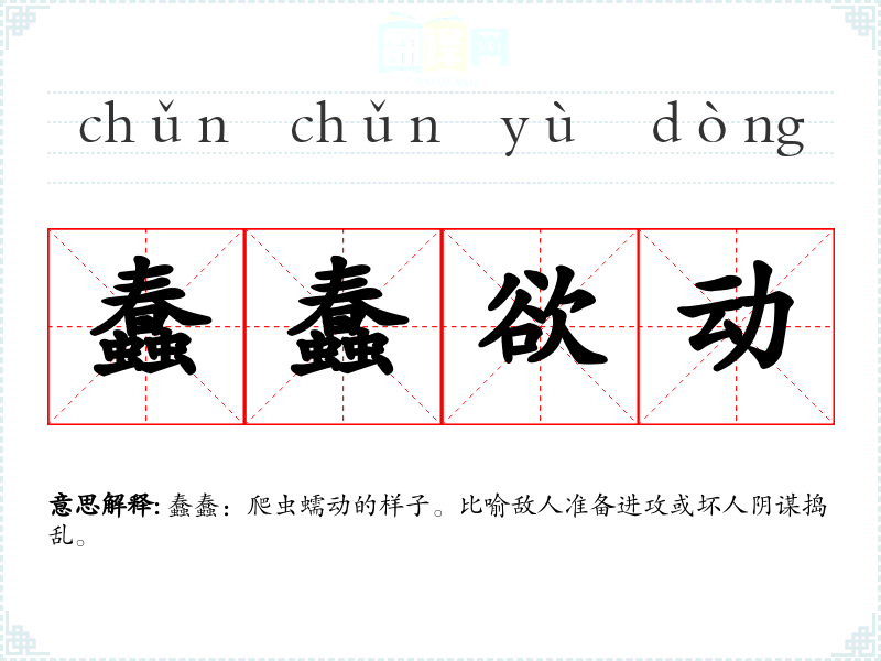 蠢蠢:爬虫蠕动的样子。比喻敌人准备进攻或坏人阴谋捣乱。