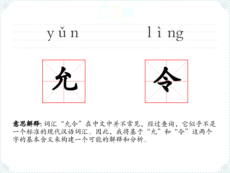词汇“允令”在中文中并不常见,经过查询,它似乎不是一个标准的现代汉语词汇。因此,我将基于“允”和“令”这两个字的基本含义来构建一个可能的解释和分析。