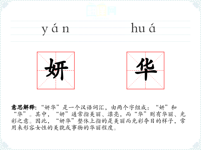 “妍”字最早见于《说文解字》,意为美丽;“华”字则有光彩、繁荣之意。两者结合的“妍华”在古代文学中已有使用,随着时间的推移,其含义和用法基本保持稳定。