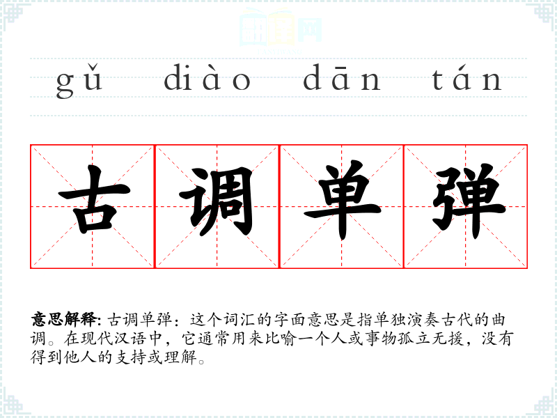 古调单弹:这个词汇的字面意思是指单独演奏古代的曲调。在现代汉语中,它通常用来比喻一个人或事物孤立无援,没有得到他人的支持或理解。