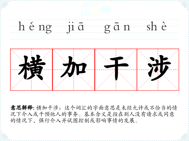 横加干涉:这个词汇的字面意思是未经允许或不恰当的情况下介入或干预他人的事务。基本含义是指在别人没有请求或同意的情况下,强行介入并试图控制或影响事情的发展。