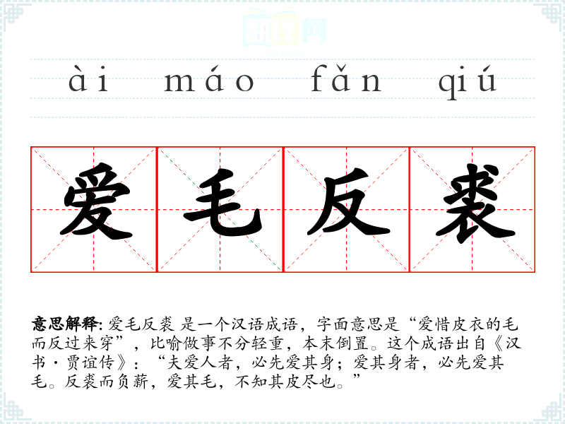 爱毛反裘 是一个汉语成语,字面意思是“爱惜皮衣的毛而反过来穿”,比喻做事不分轻重,本末倒置。这个成语出自《汉书·贾谊传》:“夫爱人者,必先爱其身;爱其身者,必先爱其毛。反裘而负薪,爱其毛,不知其皮尽也。”