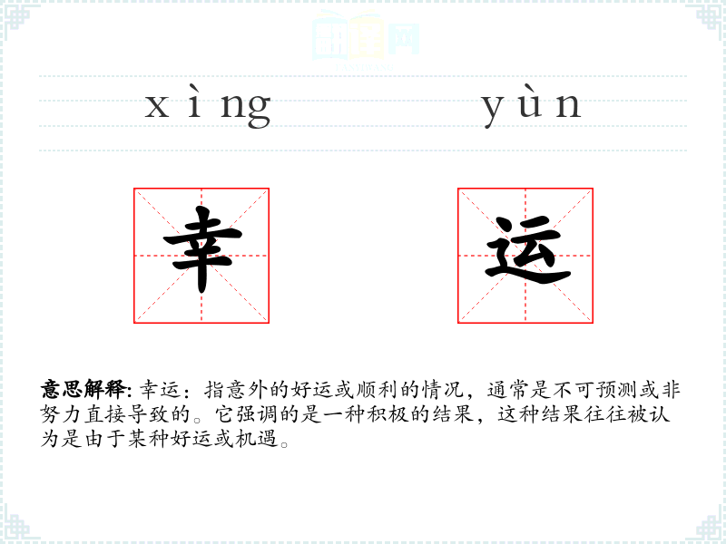 幸运:指意外的好运或顺利的情况,通常是不可预测或非努力直接导致的。它强调的是一种积极的结果,这种结果往往被认为是由于某种好运或机遇。