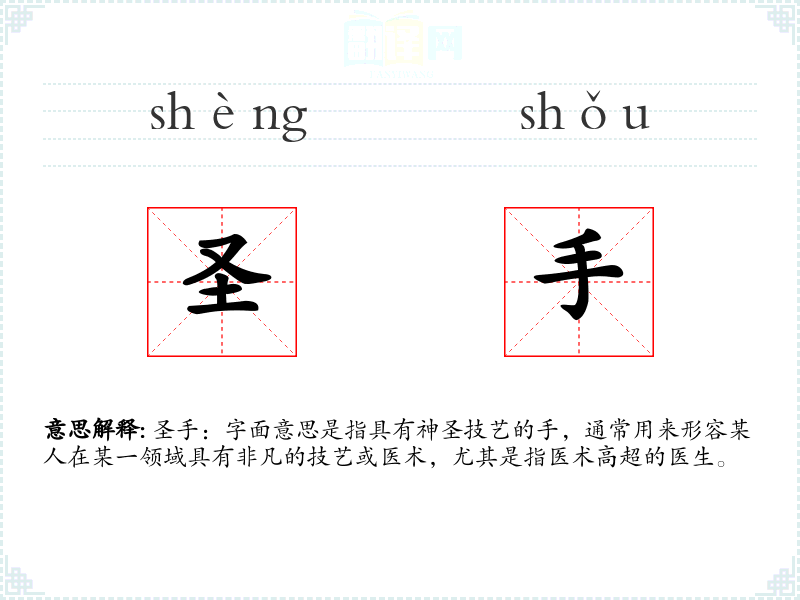 圣手:字面意思是指具有神圣技艺的手,通常用来形容某人在某一领域具有非凡的技艺或医术,尤其是指医术高超的医生。
