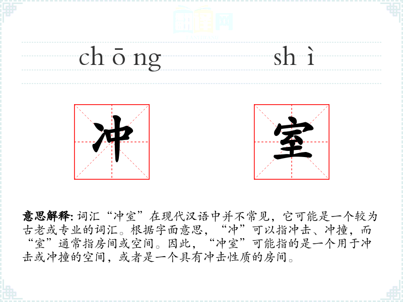 词汇“冲室”在现代汉语中并不常见,它可能是一个较为古老或专业的词汇。根据字面意思,“冲”可以指冲击、冲撞,而“室”通常指房间或空间。因此,“冲室”可能指的是一个用于冲击或冲撞的空间,或者是一个具有冲击性质的房间。