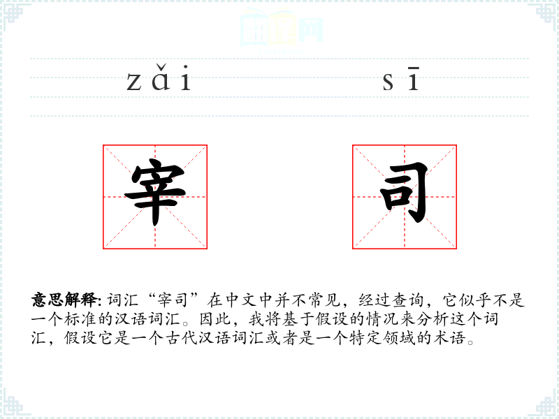 词汇“宰司”在中文中并不常见,经过查询,它似乎不是一个标准的汉语词汇。因此,我将基于假设的情况来分析这个词汇,假设它是一个古代汉语词汇或者是一个特定领域的术语。