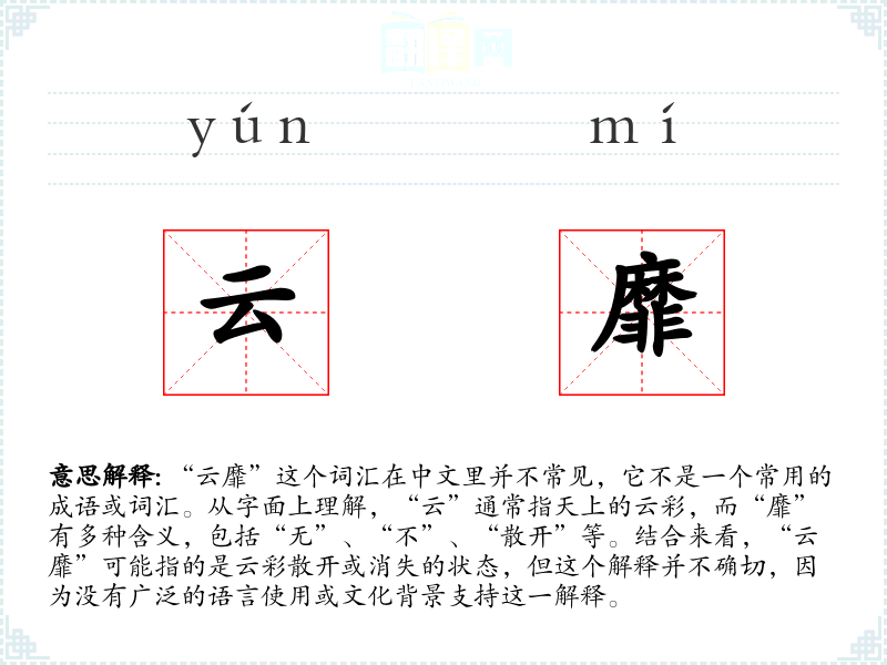 “云靡”这个词汇在中文里并不常见,它不是一个常用的成语或词汇。从字面上理解,“云”通常指天上的云彩,而“靡”有多种含义,包括“无”、“不”、“散开”等。结合来看,“云靡”可能指的是云彩散开或消失的状态,但这个解释并不确切,因为没有广泛的语言使用或文化背景支持这一解释。