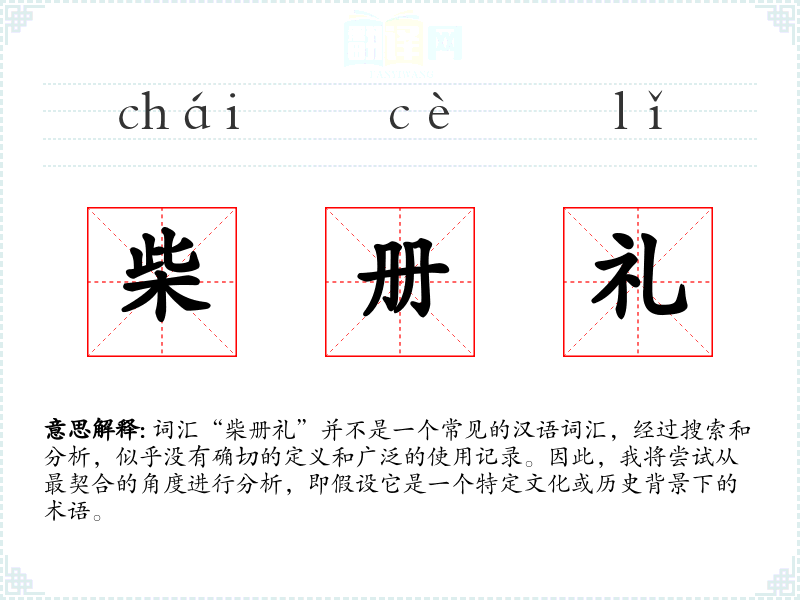由于“柴册礼”不是一个标准词汇,我们无法给出确切的字面意思和基本含义。但可以推测,“柴”可能与木柴或燃料有关,“册”可能与书籍或记录有关,“礼”通常指礼仪或仪式。因此,“柴册礼”可能指的是与木柴或燃料相关的某种仪式或记录。