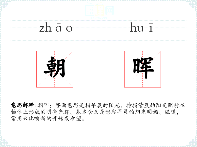 词源:“朝晖”由“朝”和“晖”两个字组成。“朝”指早晨,“晖”指阳光。