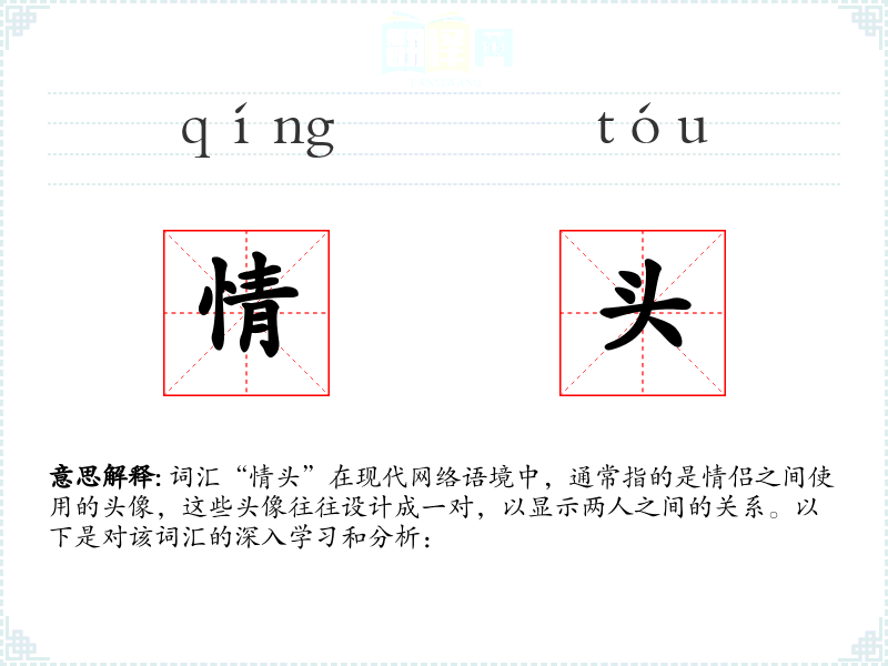 词汇“情头”在现代网络语境中,通常指的是情侣之间使用的头像,这些头像往往设计成一对,以显示两人之间的关系。以下是对该词汇的深入学习和分析: