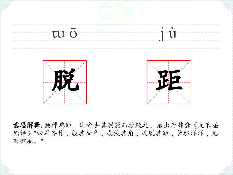 抜掉鸡距。比喻去其利器而挫败之。语出唐韩愈《元和圣德诗》"四军齐作﹐殷其如阜﹐或拔其角﹐或脱其距﹐长驱洋洋﹐无有龃龉。"