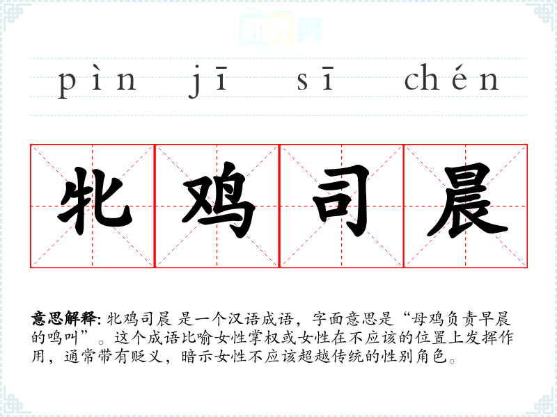 牝鸡司晨 是一个汉语成语,字面意思是“母鸡负责早晨的鸣叫”。这个成语比喻女性掌权或女性在不应该的位置上发挥作用,通常带有贬义,暗示女性不应该超越传统的性别角色。