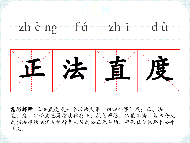 在传统文化中,正法直度** 是儒家思想中“仁政”的一部分,强调君主或政府应该以公正的法律来治理国家。在现代社会,这个词汇仍然被用来讨论法律的公正性和社会正义。