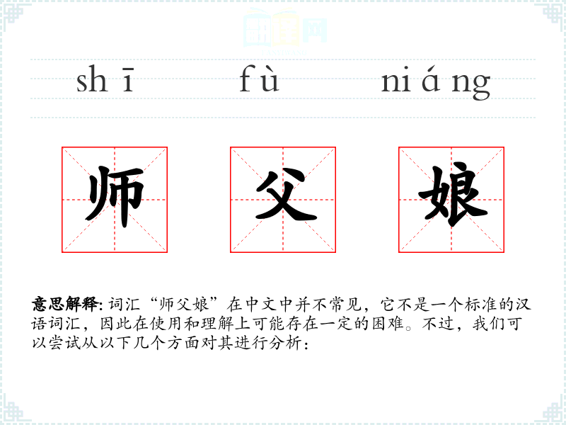 词汇“师父娘”在中文中并不常见,它不是一个标准的汉语词汇,因此在使用和理解上可能存在一定的困难。不过,我们可以尝试从以下几个方面对其进行分析: