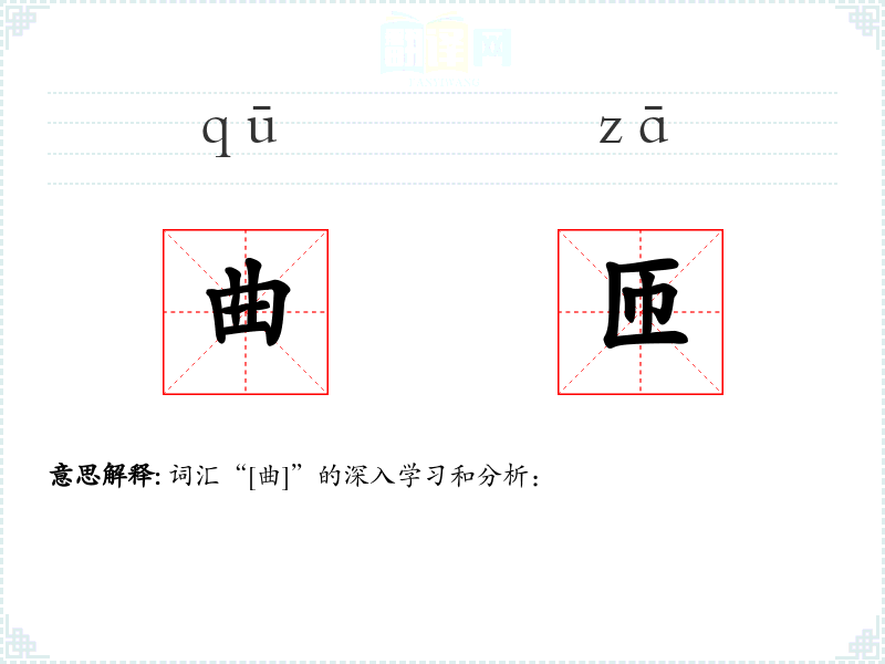 “曲”字是一个多义词,其丰富的含义和用法使其在语言表达中具有重要的地位。通过对“曲”的学*和分析,我更加理解了其在不同语境中的灵活运用,以及它在文化和艺术中的深远影响。