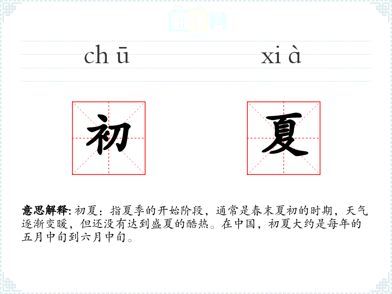 “初夏”一词由“初”和“夏”两个字组成。“初”表示开始,“夏”表示夏季。在古代汉语中,“初夏”就已经被用来描述夏季的开始阶段。