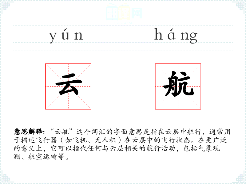 “云航”这个词汇可能是由“云”和“航”两个字组合而成,其中“云”指云层,“航”指航行。在现代汉语中,这个词汇主要用于描述飞行器在云层中的飞行状态,但在古代可能没有这个特定的用法。
