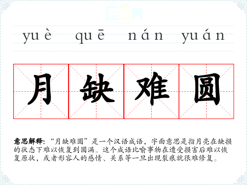 “月缺难圆”是一个汉语成语,字面意思是指月亮在缺损的状态下难以恢复到圆满。这个成语比喻事物在遭受损害后难以恢复原状,或者形容人的感情、关系等一旦出现裂痕就很难修复。
