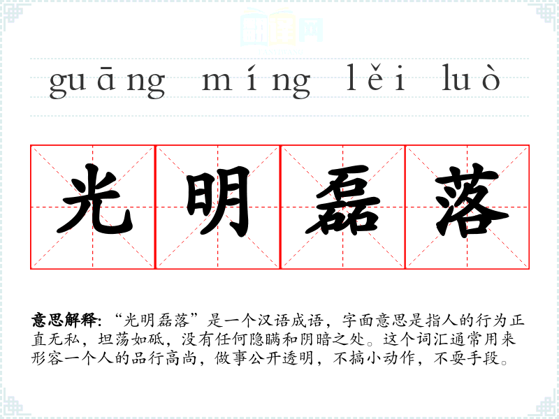 “光明磊落”是一个汉语成语,字面意思是指人的行为正直无私,坦荡如砥,没有任何隐瞒和阴暗之处。这个词汇通常用来形容一个人的品行高尚,做事公开透明,不搞小动作,不耍手段。