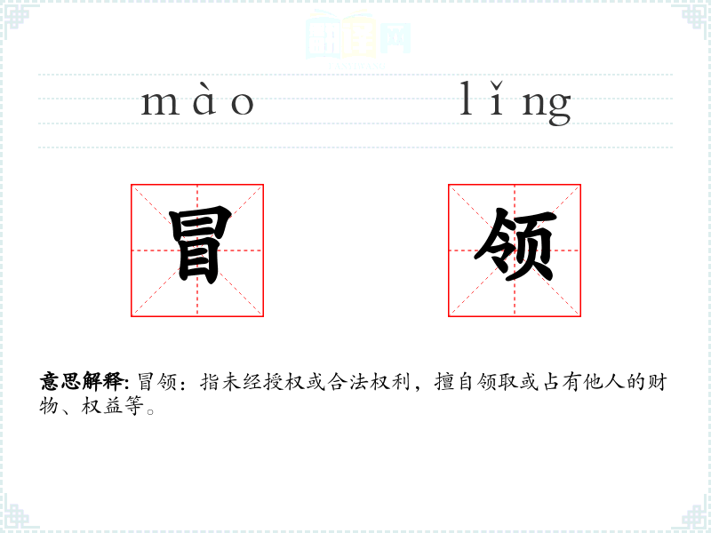 冒领:指未经授权或合法权利,擅自领取或占有他人的财物、权益等。
