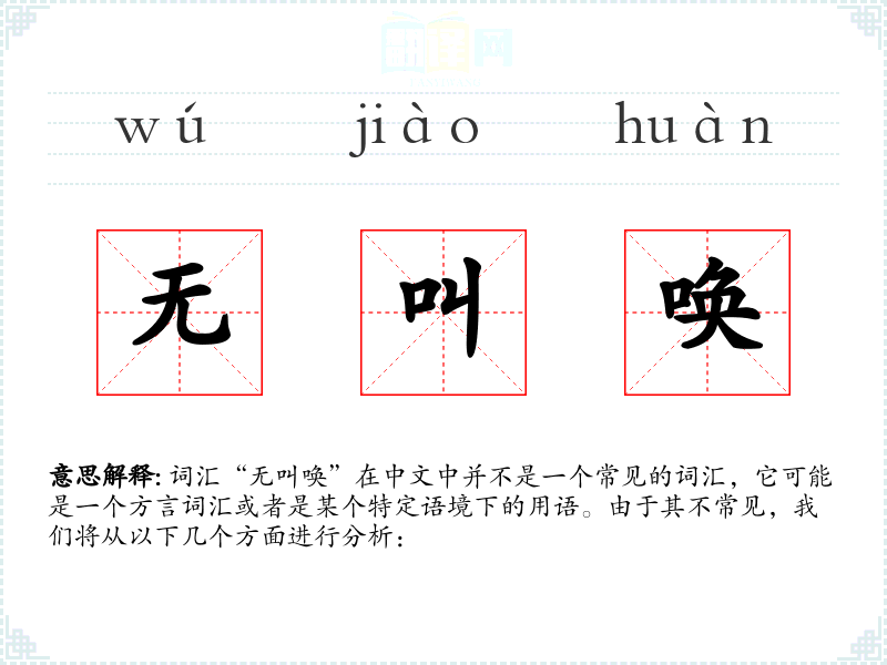 词汇“无叫唤”在中文中并不是一个常见的词汇,它可能是一个方言词汇或者是某个特定语境下的用语。由于其不常见,我们将从以下几个方面进行分析: