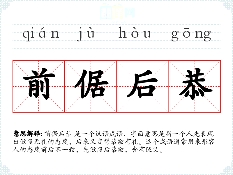 前倨后恭 是一个汉语成语,字面意思是指一个人先表现出傲慢无礼的态度,后来又变得恭敬有礼。这个成语通常用来形容人的态度前后不一致,先傲慢后恭敬,含有贬义。