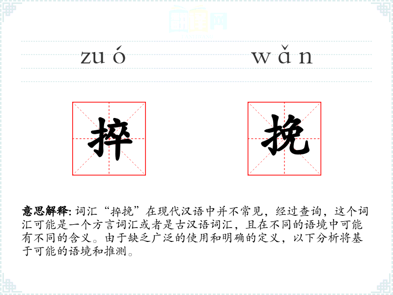 词汇“捽挽”在现代汉语中并不常见,经过查询,这个词汇可能是一个方言词汇或者是古汉语词汇,且在不同的语境中可能有不同的含义。由于缺乏广泛的使用和明确的定义,以下分析将基于可能的语境和推测。