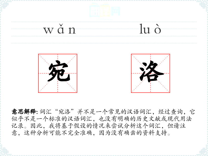 由于“宛洛”不是一个已知的词汇,我们无法给出确切的基本定义。如果假设它是一个合成词,我们可以尝试拆分理解: