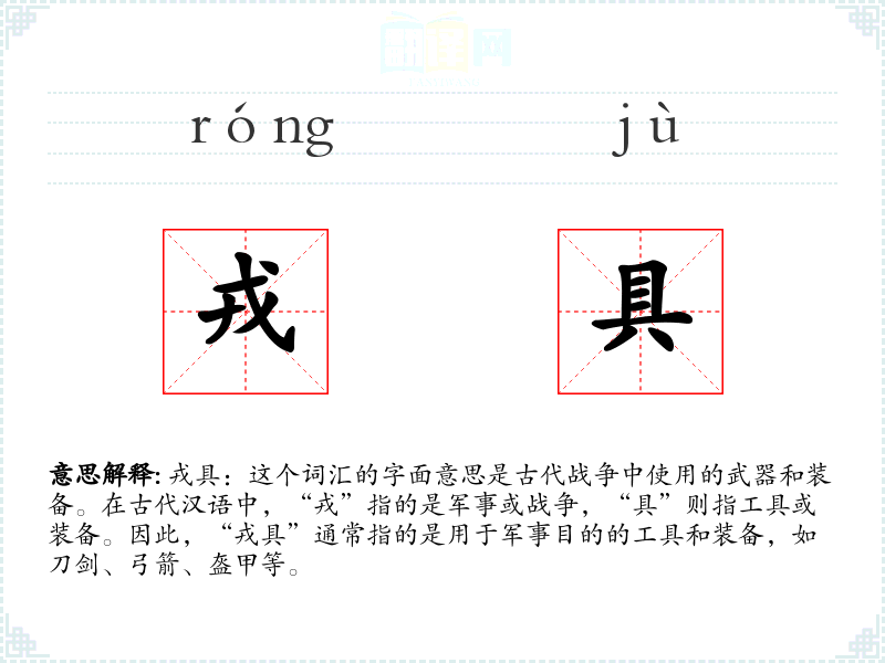 戎具:这个词汇的字面意思是古代战争中使用的武器和装备。在古代汉语中,“戎”指的是军事或战争,“具”则指工具或装备。因此,“戎具”通常指的是用于军事目的的工具和装备,如刀剑、弓箭、盔甲等。