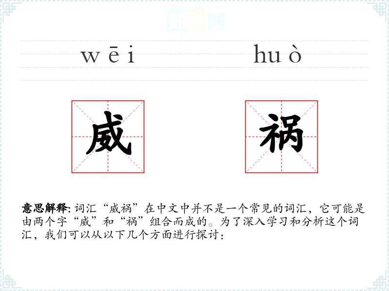 词汇“威祸”在中文中并不是一个常见的词汇,它可能是由两个字“威”和“祸”组合而成的。为了深入学*和分析这个词汇,我们可以从以下几个方面进行探讨: