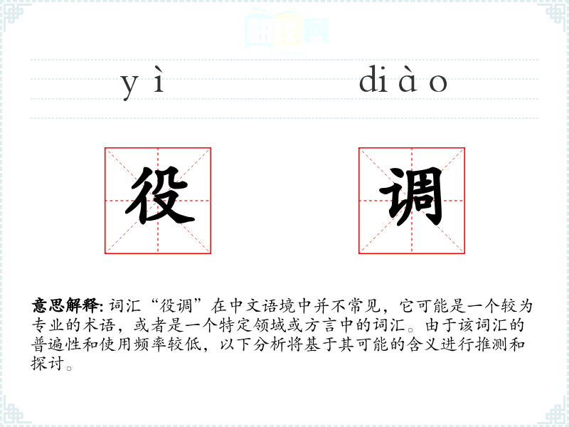 词汇“役调”在中文语境中并不常见,它可能是一个较为专业的术语,或者是一个特定领域或方言中的词汇。由于该词汇的普遍性和使用频率较低,以下分析将基于其可能的含义进行推测和探讨。