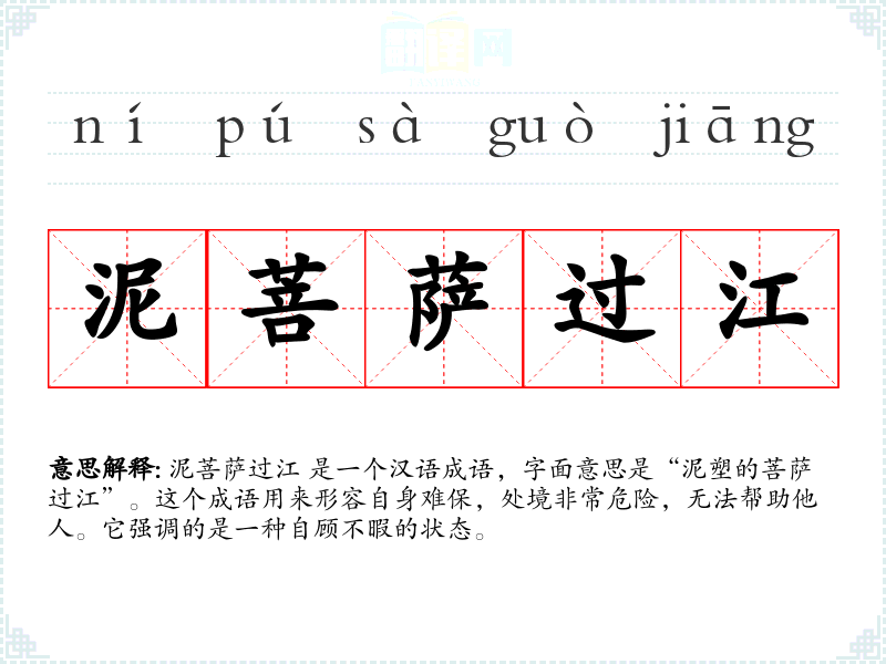 泥菩萨过江 是一个汉语成语,字面意思是“泥塑的菩萨过江”。这个成语用来形容自身难保,处境非常危险,无法帮助他人。它强调的是一种自顾不暇的状态。