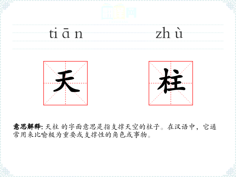 天柱 的字面意思是指支撑天空的柱子。在汉语中,它通常用来比喻极为重要或支撑性的角色或事物。